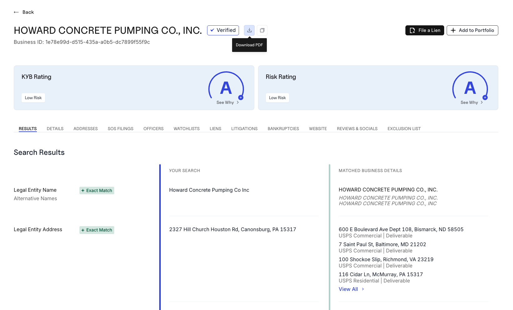 In the console, reports can also be downloaded instantly by clicking the Download PDF arrow on any completed business search, making it easy to share or attach documentation in your underwriting workflow.