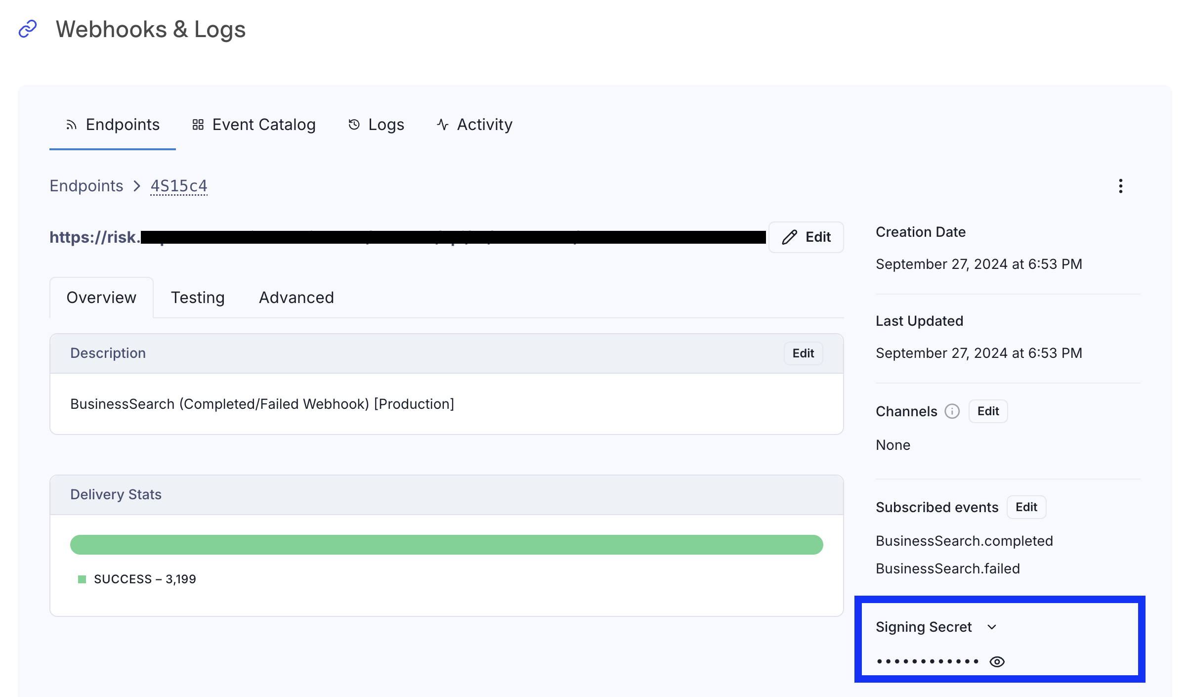 - The signing secret is displayed next to your endpoint URL