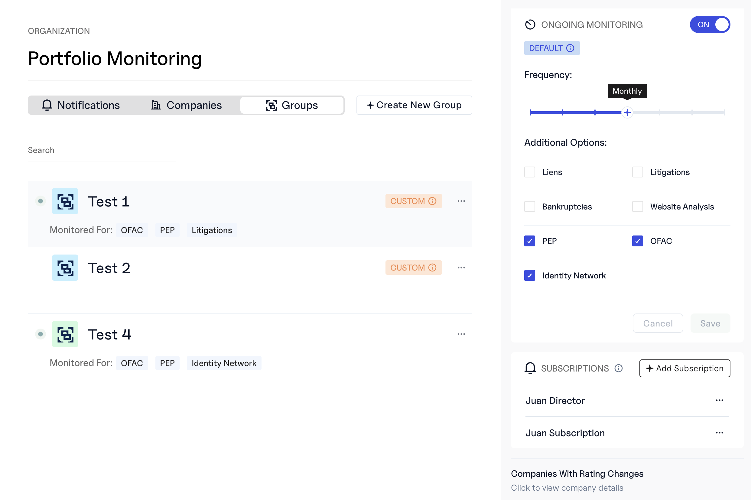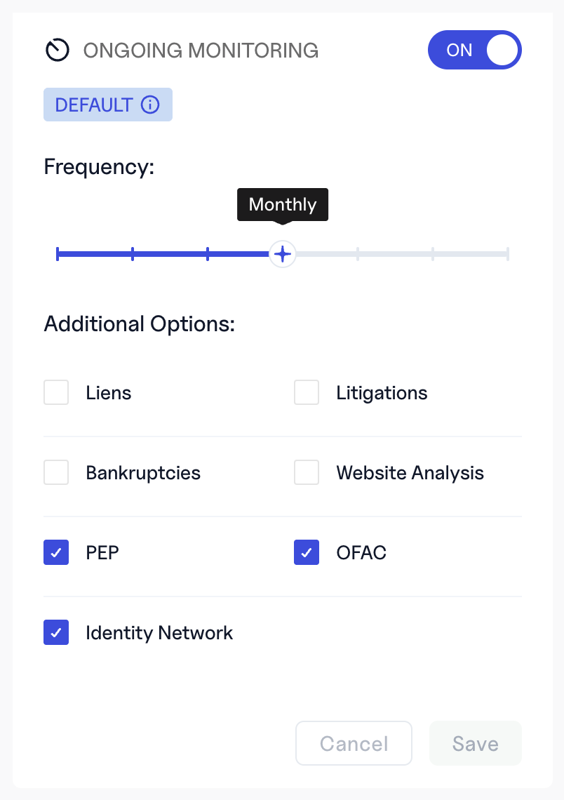 - Any selected monitorable attributes (e.g., OFAC, PEP, Liens, Litigations, Website Analysis)
