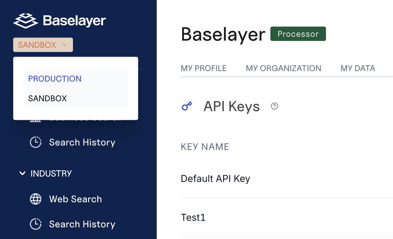In the top-left corner of the Baselayer console, you'll see a dropdown that displays either PRODUCTION or SANDBOX. This dropdown controls which environment you're currently viewing.