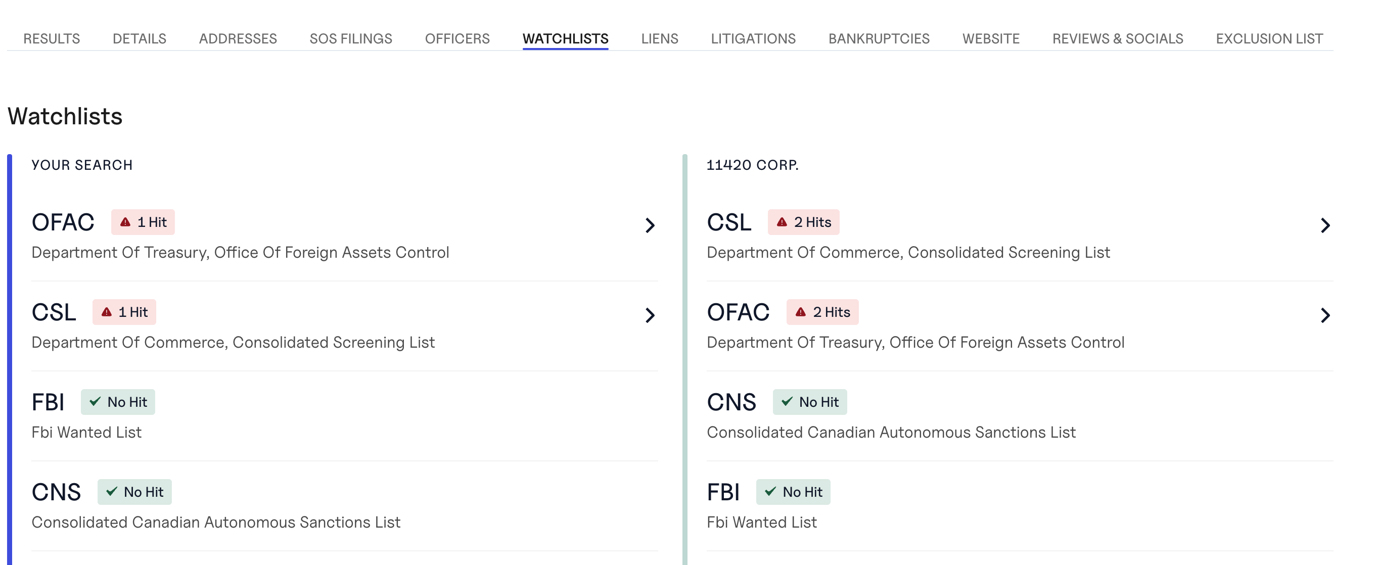 11420 CORP.matches both the CSL and OFAC lists - The count of